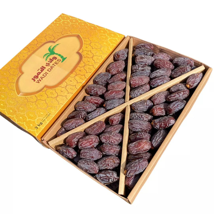 Carton weight 3 kg Majdoul Jumbo dates are distinguished by their delicious and rich flavor, combining sweetness, a pleasant touch, and a delightful taste.